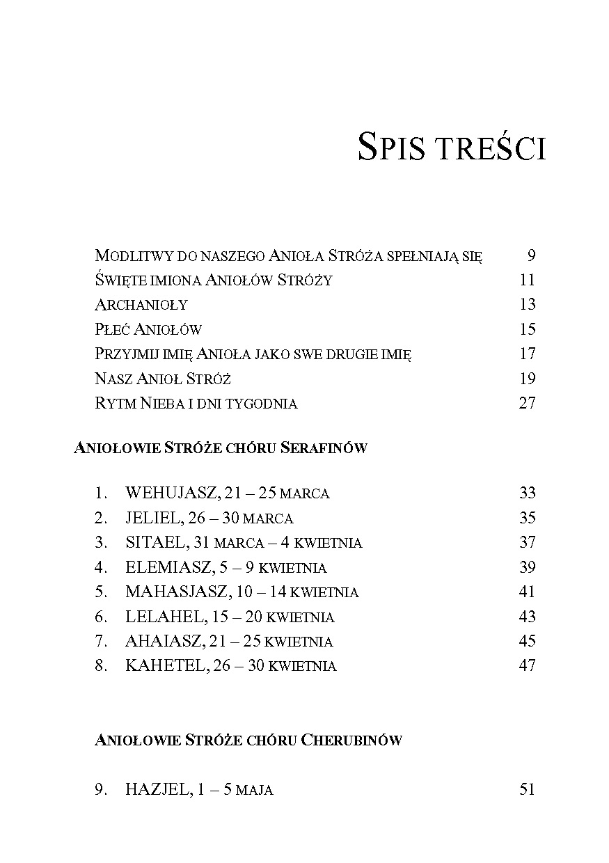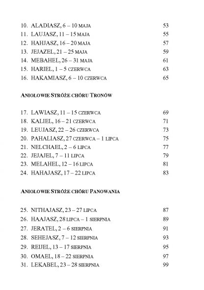 Nie tylko modlitwą powierzamy się opiece Istot Wyższych. Możemy też przyjąć imię naszego Anioła Stróża lub imię Anioła najbardziej sprzyjającego naszym planom. Możemy również nadać naszym dzieciom imię Anioła Stróża, który będzie ich obdarowywał mocą i wspierał w przyszłości. Jeżeli masz zostać chrzestnym rodzicem, możesz ofiarować ten dar opatrznościowy dziecku chrzestnemu. Kościół godzi się na najczęściej używane imiona Archaniołów i Aniołów (jak Michał, Daniel, Rafał, Gabriel), lecz czasem trzeba będzie przybrać to imię jako drugie, na przykład Teresa Ariela, Magdalena Nithaela, czy Franciszek Haziel, jak to się przydarzyło autorowi.
